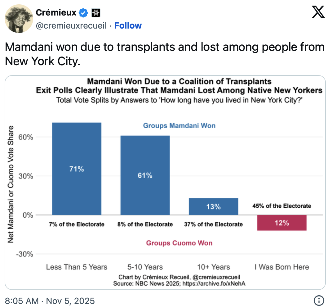 It has been pointed out that voters that have lived in New York City for less than 10 years are the reason why Mamdani was victorious…
