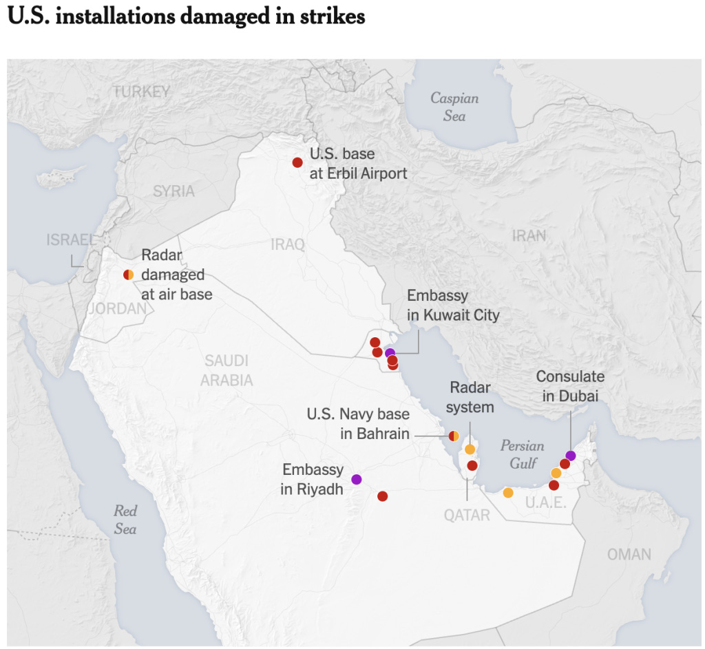 UAE: Al Dhafra Air Base (March 3), Jebel Ali port (March 1), Al Ruwais (near THAAD unit), and Al Sader facilities.