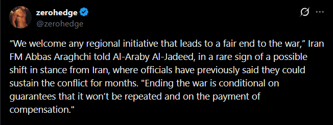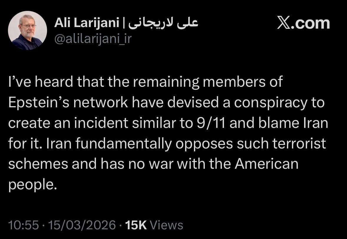 Two senior Iranian officials – Larijani and Marandi – issued separate warnings about a planned false flag attack. 9/11-style. Blame Iran. I’ve been tracking this pattern since day two. Loads of incidents by now. And now public warnings from the top of the security establishment. Either they have intelligence, or they’re building the counter-narrative in advance. Either way, it lands heavier than the missiles.