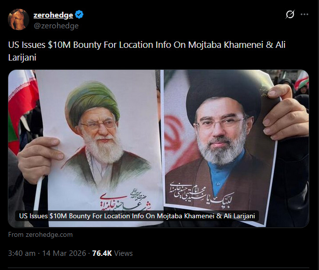 The US issued a $10 million bounty on Mojtaba Khamenei and Ali Larijani. Ten million for the Supreme Leader of a country whose military is currently winning a war of attrition against the combined air forces of America and Israel. Iran can’t find Mojtaba, Israel can’t find Netanyahu. Most expensive game of hide-and-seek. Ever.