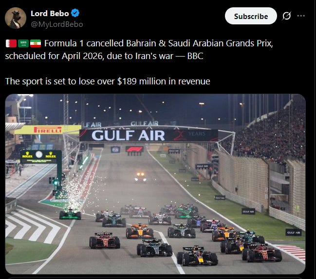 Formula 1 cancelled the Bahrain and Saudi Arabian Grands Prix. $189 million in revenue, gone. Plenty of things still going fast in the Gulf. Just not on a track.