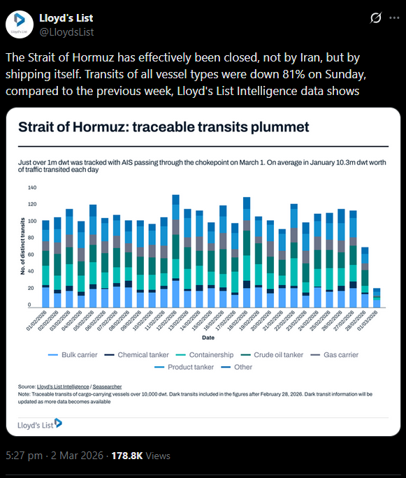 The IRGC reiterated Hormuz is closed and oil will hit $200. Shipping through the strait is down 81%. As Lloyd’s List said: “the Strait was closed not by Iran, but by shipping itself”. The insurers won’t cover it. The tanker captains won’t transit. Iran doesn’t need to physically blockade anything.