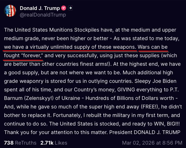 Trump’s now telling reporters wars can be fought “forever” using American stockpiles with a “virtually unlimited” supply of weapons. He posted it on Truth Social, so it should be the Truth, right? Sure, there are plenty of Cold War-era JDAMs - converted MK-84 dumb bombs with a GPS kit strapped on. But Patriots? THAADs? The things actually keeping people alive? Those don’t grow on Truth Social posts. Those take two years per missile to manufacture. And most of the existing ones were gifted to Ukraine. No refunds. Six American soldiers are dead. Eighteen seriously wounded. The war is four days old. Remember when this was supposed to be a four-day special military operation to Tehran?