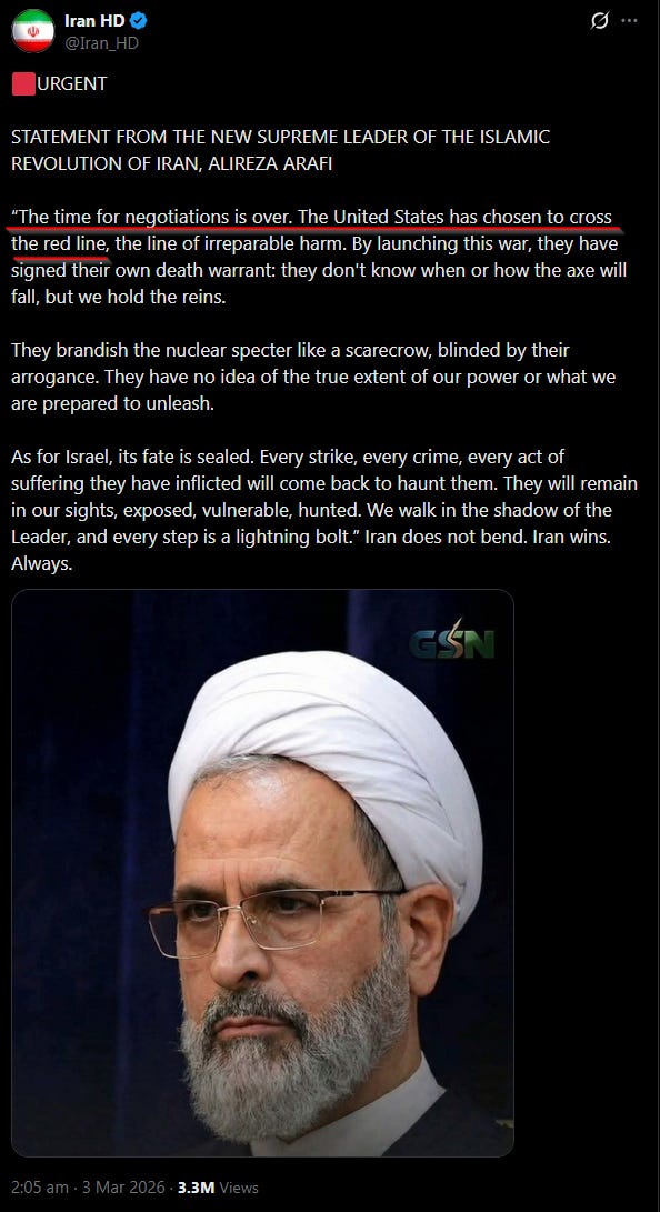 Iran named a new supreme leader anyway. Alireza Arafi. His opening statement was not what you’d call an olive branch: “The time for negotiations is over”. So the bombing achieved precisely nothing except turning a succession process into another martyrdom narrative. Again. Really nailed that one.