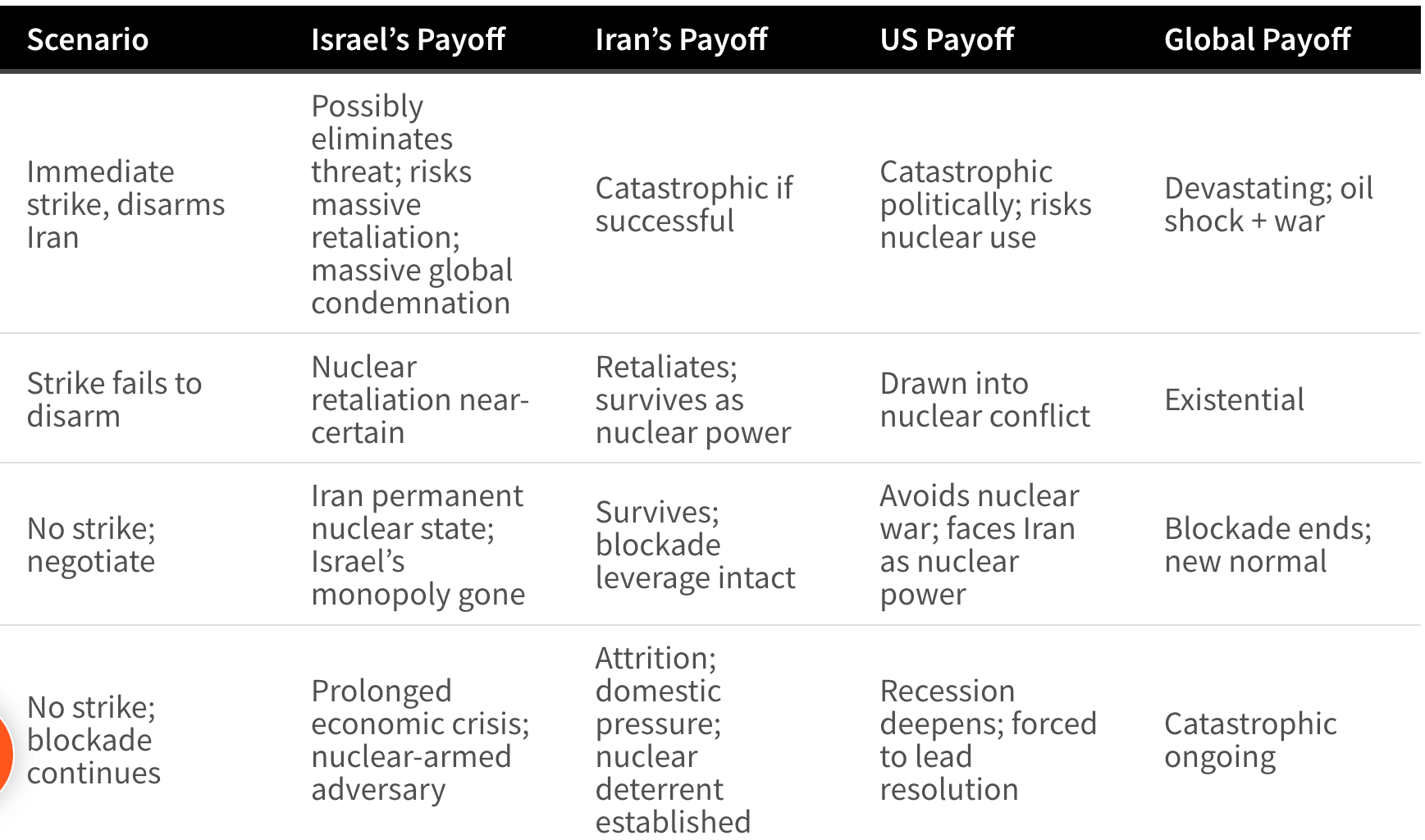 Option B: Nuclear first strike: The logic: overwhelming force eliminates the threat permanently. The problems: near-certain retaliation if even one Iranian weapon survives; complete international isolation including likely abandonment by the US; global economic catastrophe from a nuclear exchange in the Gulf; permanent delegitimisation of Israel internationally. This option was always available but its expected payoff is so negative that rational actors virtually never choose it. Expected value: catastrophically negative.