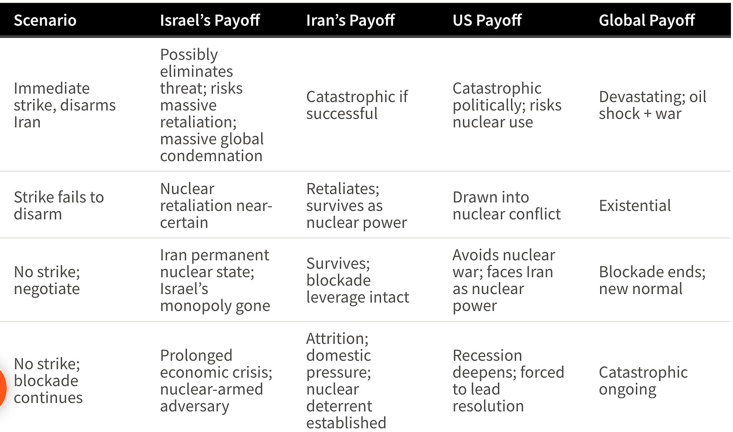 Game theory’s prediction is that rational actors, facing a choice between catastrophically negative expected values and merely deeply unpleasant ones, choose the latter. Israel’s rational move is Option D - though domestic political pressures may make this extraordinarily difficult to implement.